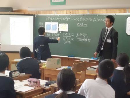 授業では、スクリーンに提示された色々な図形を見て、これまでに学んだ三角形と四角形の条件と照らし合わせながら、どれが三角形・四角形かを考えました。