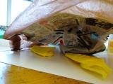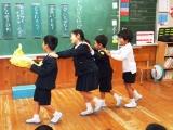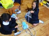 この「くしゃくしゃがみ」の技が気に入ったらしく,国語の「むかしばなし発表会」で,「青い鳥」のチームが,鳥かごを新聞紙で,青い鳥を色薄紙で本物のようにつくって劇の小道具にしていました。「金のがちょう」チームは,大きながちょうを新聞紙と黄色の色薄紙でつくり,持って歌いながら楽しい劇を見せてくれました。