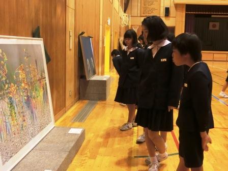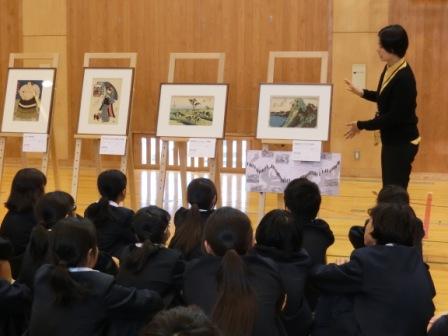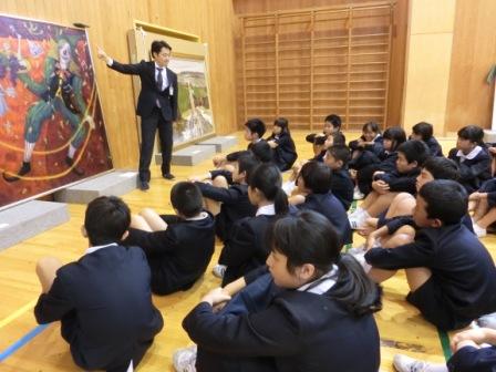 体育館には、油絵、浮世絵、彫刻など、たくさんの作品が並べられ、3~6年生が1時間ずつ学芸員の説明を受けながら、1・2年生も昼休みの短い時間ではありましたが、本物の美術作品を鑑賞しました。