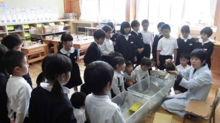 1年生は、お話して下さる杉浦さんの顔を見ながら真剣に話を聞いたり、実際に体験したりしながら、お世話の仕方を学びました。