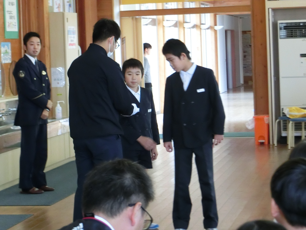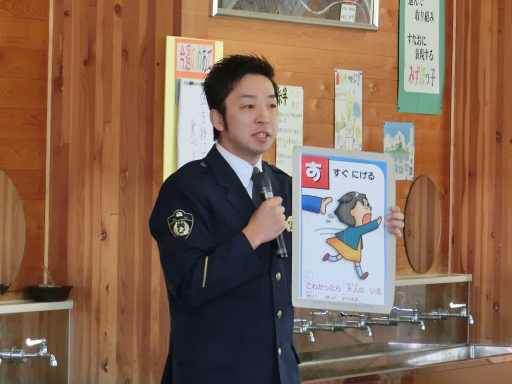 その後、羽咋警察署生活安全課 小坂係長他2名の警察官により、不審者と出会ったときに気をつけなければならないことを「いかのおすし」の言葉で示した行動が、なぜ大切なのかについてご説明いただきました。