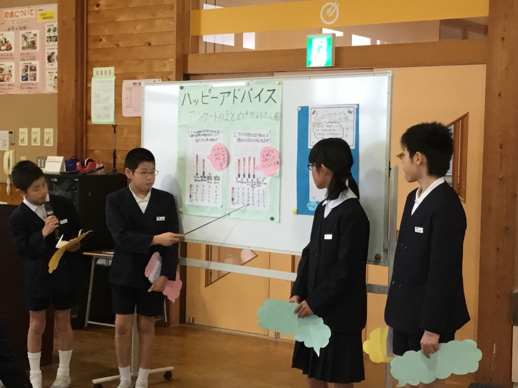 テーマは「いじめ」です。まず、保健委員会の活動であるハッピーアドバイス(子供同士が悩みをうち明けそれに応える活動)についての報告がありました。今回は1~5年生の悩みに6年生が応える取組でした。保健委員からはアドバイスの内容や、かけてもらって安心した言葉が紹介されました。