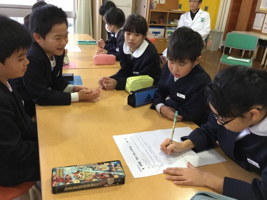 その後、スクールカウンセラーの中野先生から実際にあったいじめについての事例を紹介してもらい、5,4年生混合の縦割りグループで自分がいじめる側・いじめられる側・まわりで見ている側のそれぞれの立場ならどうするかについて、思いを語り合いました。その後、全体に発表し、自分と違った意見にふれる機会を持ちました。中でも「自分はいじめられている友達を見て助けることができるか」の問いかけについて考える場面では、「もし、次に自分がいじめのターゲットになったらと考えるとこわくて勇気がでないかもしれない」や「そのままにしておいても、いつかは解決するのではないか」など本音を語り合い、様々な考えにふれる機会となりました。
