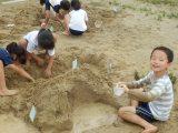 ふり返りでは,「ペットボトルは水があんまり飛ばないけど,マヨネーズの容器はよく水が飛んだよ。穴が小さくて容器が柔らかいから勢いが出やすいのかな。」「水を流したら,水が貯まるところとすぐに砂にすいこまれていくところがあったよ!石みたいな砂の隙間に水が入っていくんじゃないかな。」などと,たくさんの気づきがありました。