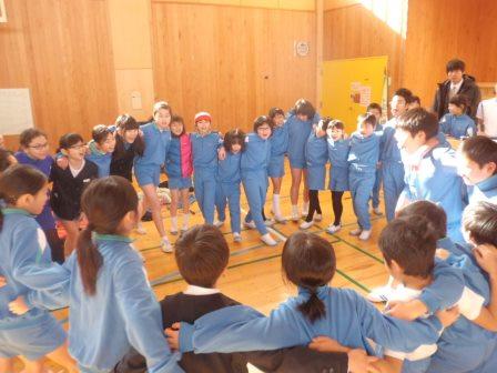 次の長なわは、学年で飛ぶ「みんなでジャンプ」と、縦割りグループで跳ぶ「8の字跳び」で競いました。逆転をねらい、円陣を組んで気合いを入れ、いざスタート!低学年のなわに入るタイミングをサポートする上級生の姿や、ジャンプに合わせてなわを回す回し役の姿など、回数だけではなく、これまで育んできた縦割り集団の温かい心が感じられました。
