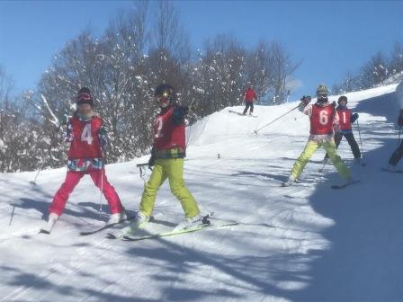 初日のゲレンデは、青空が広がる絶好のコンディション!8名の先生方の指導を受け、各グループは思い思いのシュプールを描いていました。