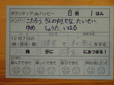 ジャンケン大会の後は,7日に予定している「ボランティアdeハッピー活動」の計画を考えました。「ボランティアdeハッピー活動」とは,縦割りの小グループごとに,ボランティア活動を考え,それを実行することです。そこで,今日はそれぞれのグループで,朝,長休み,昼休みのどこかで,何ができるかを考えました。