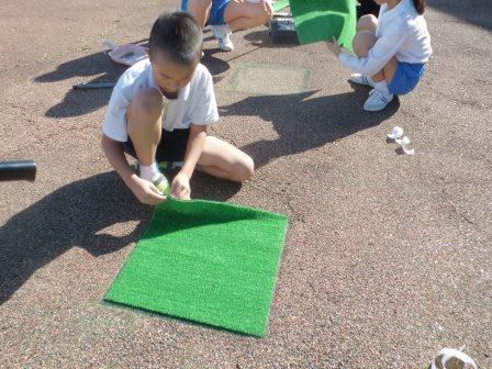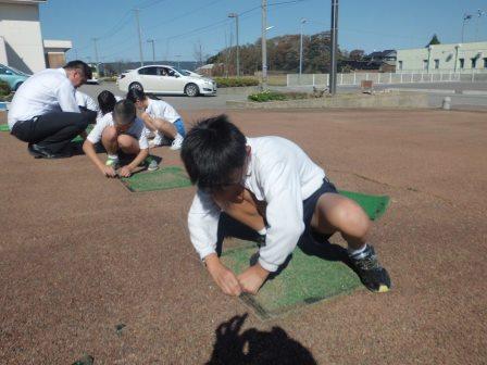 その後、企画委員が一人一枚のマットを剥がし、新しいマットに交換する作業を行いました。強力な両面テープがなかなか剥がれず大変でしたが、指先を黒く汚してまでがんばりました。6枚のマットがきちんと並ぶように心を合わせ、丁寧に貼りました。新しいふかふかのマットの上に立つと、「わあ、気持ちいい!」と笑顔になりました。