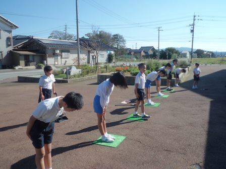 本校には、3年前から玄関の前に約50センチ四方の緑のマットが置かれています。児童は登校するとマットの上に立ち「お願いします!」、下校の際は「ありがとうございました!」と校舎に向かって挨拶します。「感謝しマット」と児童が名付け、本校の伝統になっています。