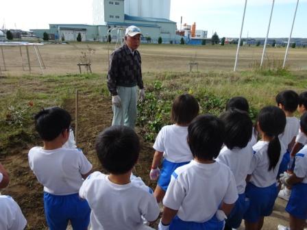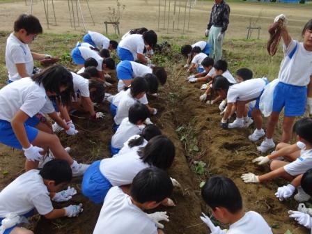 2年生がサツマイモほりをしました。5月に苗を植えてから,水やりを続け,ようやく収穫の日を迎えました。2年生の畑は地元の畑名人の中田さんがずっとお世話をしてくださいました。中田さんのおかげで,ミニトマトやピーマンもたくさん獲れました。今回はサツマイモの収穫ということで,子供たちはとっても楽しみにしていました。