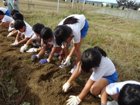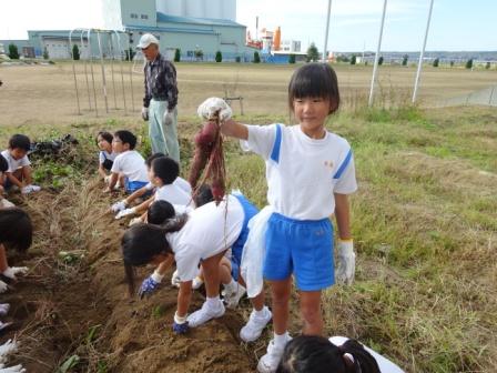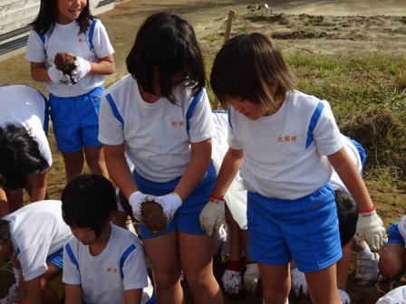 まずは畝を覆っていたビニールをめくり,くき伝いにサツマイモを探しました。2年生からは大きなサツマイモが獲れるたびに歓声が上がりました。