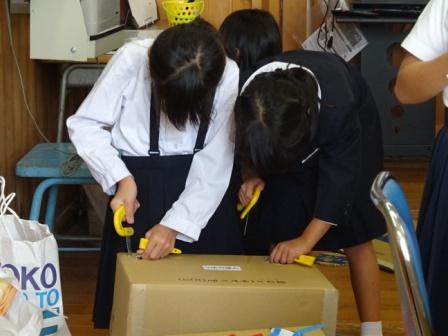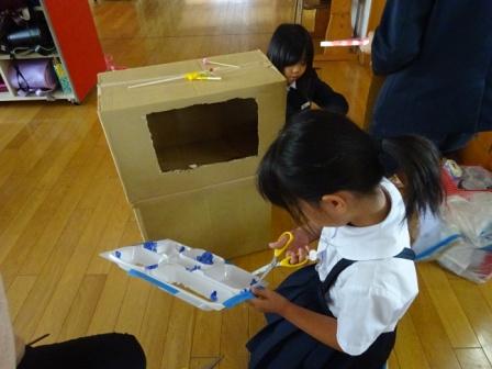「とばす・なげる・転がすおもちゃ編」に入りました。音の出るおもちゃと違い,遊びやゲーム性の要素が強まり,ますますおもちゃ作りに熱気を帯びている2年生です。今回から新たな材料として,段ボールが増えました。さっそく段ボールカッターを使って,段ボールを切ったり,穴をあけたりしていました。
