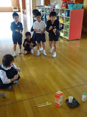 しかし、肝心のとばすおもちゃ作りが未完のまま、多くの子が賞品作りに夢中になっています。例えば、色紙で手裏剣を作ったり、モールで小物を作ったりと・・。授業者の内心では、『本筋のおもちゃ作りからそれているでは?』と思い、すぐに指導しようと思いましたが、あえてやめました。