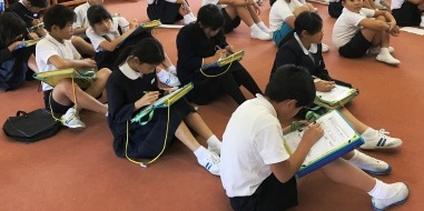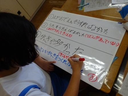さて,その後は教室に戻り,振り返りをしました。「どうすればもっとよい演奏ができたかな?改善点を見つけよう!」という課題を設定して,振り返りをしました。それぞれのグループで,ボードに改善点を挙げました。次回の授業では,この改善点を他のグループと伝え合って,それを見直します。明日の授業も,興味深い内容になりそうです。(つづく)