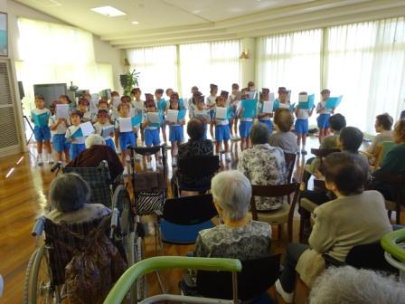 2年生が施設に到着すると,みなさん,嬉しそうな笑顔で迎えてくれました。子供たちはたくさんのお年寄りの前で,何かワクワクしている様子でした。まずは,「世界が一つになるまで」を歌いました。そして,音楽の時間に学習した「いるかはざんぶらこ」をカスタネットでの3拍子付きで,合唱しました。