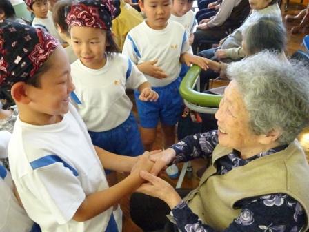 元気のよい子供たちのダンスに自然と笑みがこぼれます。発表会の最後には,みなさんと「ふるさと」を歌いました。歌を聴きながら涙を流されたおじいちゃんやおばあちゃんもいました。そして,握手タイムです。