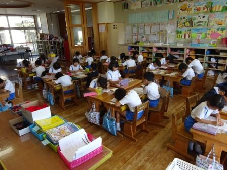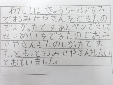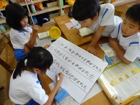 さて,お客さん役の子たちは自分たちのグループに活かせそうな情報を持ち帰り,それを共有します。2年生ではこれを「おみやげを広げる」と言います。どのおみやげが良いか,一つ選んでそれを書き記したり,自分たちの改善点を赤で訂正したり,付け加えたりします。