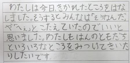 そして,まとめをした後で,授業の振り返りを書きます。振り返りの時間は黙々と書き続けます。鉛筆の走る音しか聞こえない,心地の良い沈黙の時間です。時間がきても,「もっと書かせて!」という子がほとんどです。書ききれないほどの思いや気付きが生まれたのでしょうね。