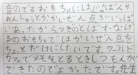 今回の「音の出るおもちゃ編」では,「主体的で対話的な深い学び」の片鱗を見ることができました。次回からは,いよいよ「とばす・なげる・転がすおもちゃ編」に入ります。これからの遊びには,ゲーム性の要素が入ってきますので,ますます盛り上がりそうです。子供たちも楽しみに待っています。どうなることでしょうか,こうご期待です!(つづく)