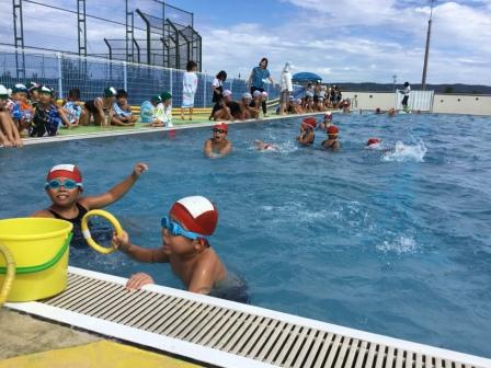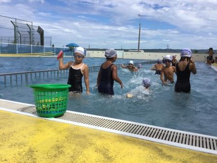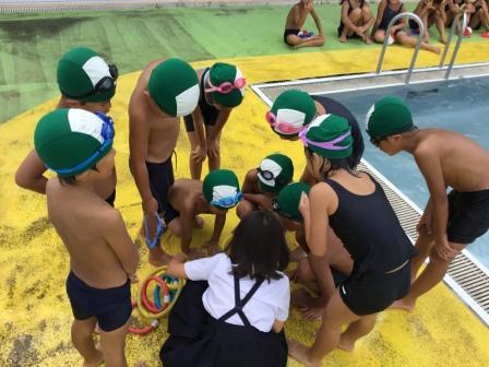 種目は、低学年は「宝拾い」、高学年は「騎馬戦&宝拾い」で、いずれも縦割り班対抗として競い合いました。結果は、低学年は赤組、高学年は白組の勝利となりましたが、大変暑い日だったこともあり、どの子もプールのひんやりとした水を気持ち良く感じているようでした。