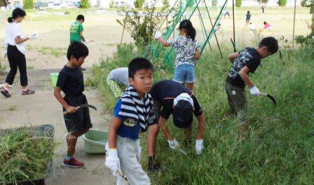 早朝からの作業にもかかわらず、たくさんの保護者のみなさんと瑞穂っ子の参加がありました。都合がつかない方の中には、事前に来校して除草作業にあたってくださった方もいらっしゃいます。