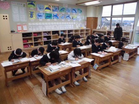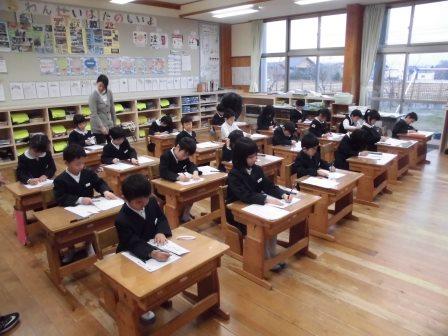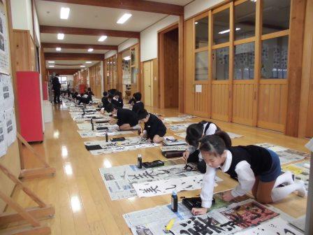 その後、教室に戻り、書き初め大会が行われました。冬休みに練習を重ねた成果を発揮し、どの子も、一画一画に思いを込めて真剣に書き上げました。硬筆の作品を書いた1,2年生は各教室の前に、毛筆の作品を書いた3~6年生の作品はランチルームに、12日(金)まで展示してあります。