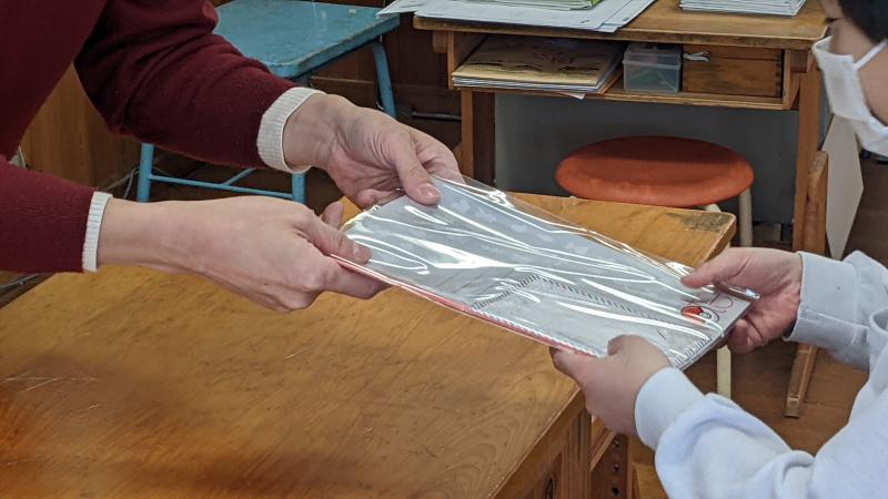 人気キャラクターのイラストが描かれたノートに児童は、マスク越しにもわかる笑みを浮かべたり、ガッツポーズのリアクションをしたり、とても喜んでいました。