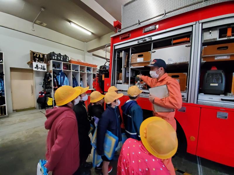 消防車の中には何が入っていてどんなことに使うのか説明を聞いたり、出動を想定した消防士の方々の動きを見たりしました。