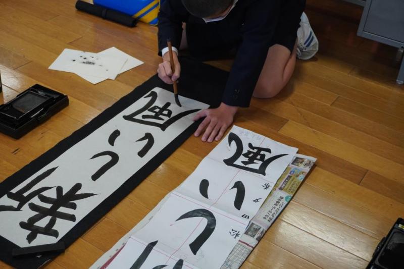1月7日(金)のウォームアップ教室で全校児童が書き初めをしました。