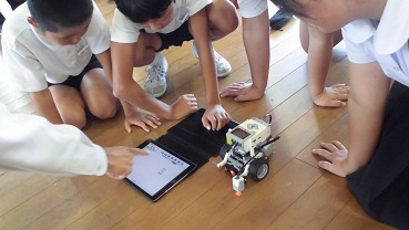 タブレットで「〇秒前進」「右に〇度曲がる」などの命令を