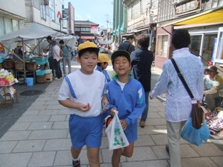 朝市では,何を買おうかよく考えて,お菓子やわらじのキーホルダーなど欲しいものを買っていました。お店の人におまけをしてもらったり,友達と相談したりして,よい買い物をしていました。