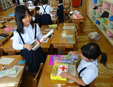 音の出るおもちゃ作りが始まりました。最初に,教師の作ったモデル作品を見せました。モデル作品は,「ギロ」と呼ばれる楽器をペットボトルと割り箸,竹串でつくりました。子供たちの前で楽器をギコギコと鳴らしてみると,「すごい!」「わたしもやってみたい!」という声がたくさん聞こえました。モデル作品によって,音の出るおもちゃ作りへの意欲がますます高まったようです。さっそく,子供たちは家庭から持ってきた身近な物を使って,音の出るおもちゃを作り始めました。一度,おもちゃ作りのスイッチが入った子供たちの集中はさすがです。一人で夢中になって作っている子や友達の手を借りながら作る子などその様子は様々ですが,みんなとても楽しそうに活動し,主体性,協働性がよく見られます。そして,出来上がったおもちゃは教師の想像を超えるオリジナリティ溢れる作品ばかりでした。完成品やおもちゃを使っての交流,振り返りは次回紹介します。(つづく)