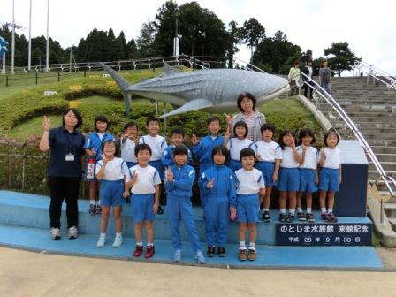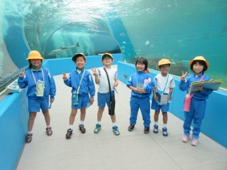 そして,のとじま水族館では,イルカショーを見ました。イルカが大きなジャンプをするたびに歓声が上がりました。お弁当を食べた後は,縦割りグループで館内ウォークラリーをしました。クイズは,「ジンベエザメのお食事の時間は何時でしょう?」や「水槽にイワナは何匹いるでしょう?」というものでした。グループで協力しながら,楽しく問題を解いていました。