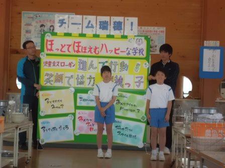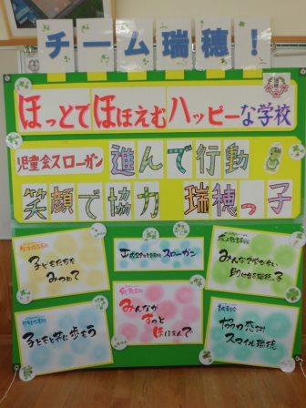 玄関に飾られる、「チーム瑞穂」の心意気。学校・児童会・PTAの絆を深め、「自分もまわりの人も大切にする」瑞穂っ子を育てていきたいと考えています。