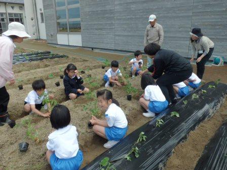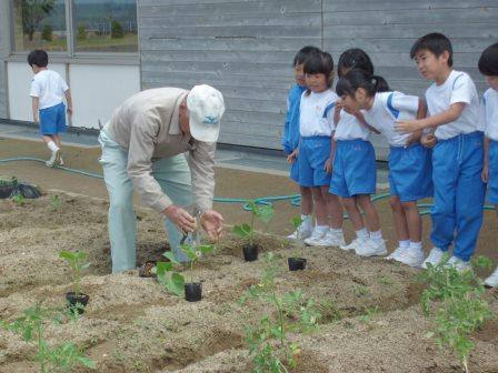 生活科の学習で、さつまいも、トマト、きゅうりなどを植え、自分たちで継続的に栽培・観察していきます。この日は、毎年お世話になっている地域の畑の先生をお招きし、「植え方のコツ」を伝授していただきました。「さつまいもは風の向きを考えて、こうやってねかせるんだよ」「花の咲いている方を手前にするんだよ」「しっかり土をおさえてね」など、子ども達はなるほどと目を輝かせ、いっしょうけんめい植えていました。お世話をがんばり、大きく育ってくれるといいですね。収穫の喜び、味わう喜びをみんなで分かち合えるといいです。