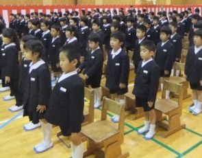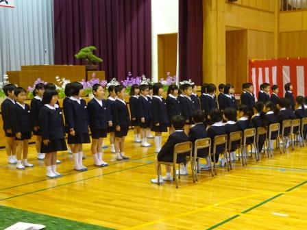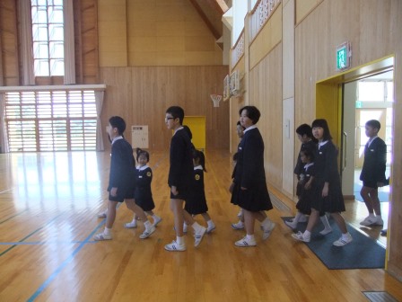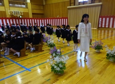 6年生に手をつながれた1年生が入場すると、体育館は温かい拍手に包まれました。