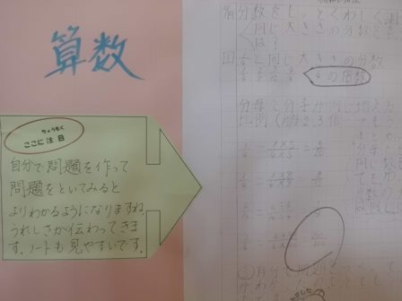 今回は前回の9月に比べ、「はじめの考えと今の考えの比較」「友達の発言の仕方のよさ」「考えの理由の明示」など、内容もより具体的になってきました。そして、書く量も増え、文字も丁寧になってきました。