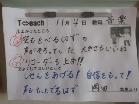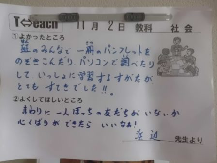 教師が互いに授業を参観し合い、子どもたちに学び方のすてきなところとがんばってほしいところなどを伝える「ティーチ」。教師にとっては、課題・発問・指示・授業展開など、相互に指導法等について学び合う場となります。
