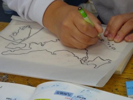 図工(版画)で学習した転写の技法を使って,日本地図を描いている子