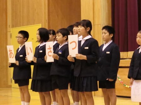 オープニングでは、5年生による「絆アップ宣言」が行われ、「あいさつ・なかよし・きりかえ」のキーワードが張りのある大きな声で発表されました。