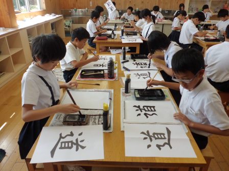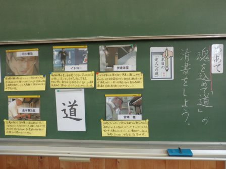 先週まで、文字の組み立て方や穂先の動き、しんにょうのバランスや最後の右はらいなどについて練習し、形よく書くコツをつかみました。そして、今回は清書の時間。いつものようにコツを再確認し、清書、ふり返りをして終了でもよいのですが、この「道」という字は、これからの自分の生き方や未来を考えるポイントになる字でもあると考え、より気持ちを込めて清書に臨むことができるよう工夫しました。それは、様々な分野で活躍するプロの生き方を写真と語録で紹介するものです。NHKで放送されている「プロフェッショナル」から、イチロー選手、宮崎駿監督、羽生善治名人などの生き方を紹介しながら、日々のたゆまぬ努力の大切さや、夢を持って生きることのすばらしさを感じながら、この「道」という字の清書に取り組みました。いつも真剣に取り組む6年生ですが、今回はめあてにした「魂込めて書く」を実行できたように思います。