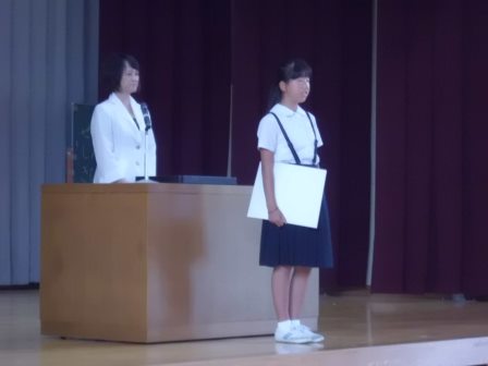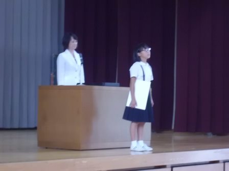 この夏休みに福井県で開催されたサッカー大会で、羽咋フットボールJr.のみなさんが見事優勝を飾りました。本校にも、そのクラブのメンバーがいて、9月5日(金)の給食終了後、全校児童が見守る中で、表彰を行いました。校長先生から、表彰状とトロフィーを受け取った3人のメンバーは、受賞後、一人ずつ全校のみんなに向けて決意を語りました。今回の好成績は、不断の努力と日々の学校生活で培った「最後まであきらめずに取り組む」という瑞穂魂がもたらしたのではないかと考えます。