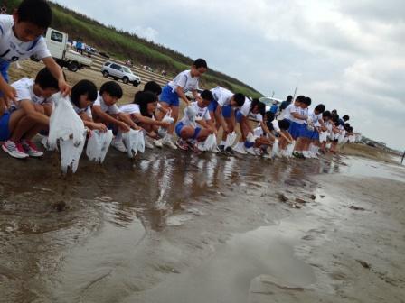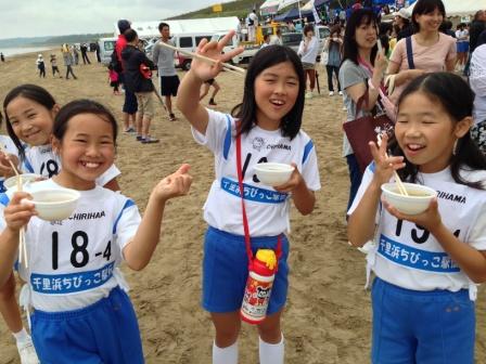 そんなすばらしい砂浜を,今年も4~6年生の瑞穂っ子が「絆」のタスキをつないで駆け抜けました。