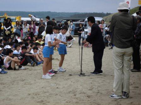 選手達は,閉会式の前に一人一砂運動にも参加し,千里浜海岸の保全にも貢献しました。