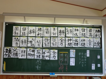 「絆」「団結」「勝利」など、一人一人の運動会にかける熱い思いが一画一画に表れていました。