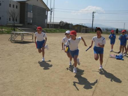 運動場を半周ずつ走ってバトンをつなぐ競走ですが,子どもたちは,よく考えます。