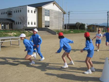5,6年生の体育では,毎時間,たてわり班を活かした「たてわリレー」を