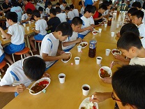 大会終了後,PTA育成委員の皆さんのお世話で,学校でカレーライスをいただきました。そして,6年生は,練習で3年間お世話になった指導者の木村さんにお礼のお手紙を渡しました。