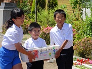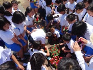14日(水)に花を咲かせよう集会~心に花を咲かせようプロジェクト~がありました。数日前から,縦割りの小グループごとにプランターにメッセージやイラストを描き,当日はみんなでマリーゴールドやサルビア、ベゴニアの花を植えました。