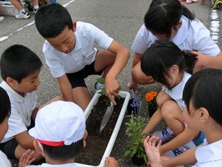 リーダーの6年生の声かけで休み時間に集まり、「きれいな花が咲きますように。」といった一人一人の願いを書き込んだプランターに、当日は3種類の花を植えました。